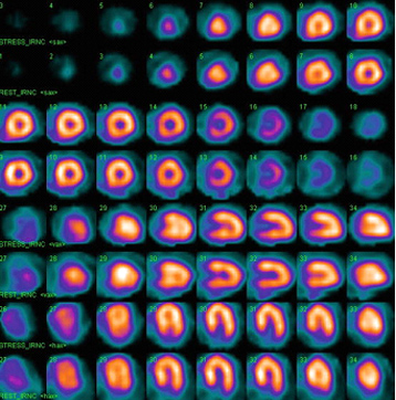 Stress MPI is a nuclear medicine investigation that evaluates the blood flow to the heart. In the investigation, a small amount of radiotracer is injected into the patient. The radiotracer distributes in the heart based on the blood flow is used. Two scan’s are acquired, one with the patient in resting state (called a “rest” scan) and another after either exercise or medication in order to increase blood flow to the heart (called a “stress” scan). The two stress and rest images are compared to get the desired information about the blood flow to the heart.