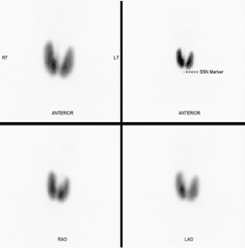 A thyroid scan is a nuclear medicine investigation for the evaluation of disorders of the thyroid gland. In this investigation, a small amount of radiotracer is either injected or given orally to the patient and then imaging of the thyroid is done.